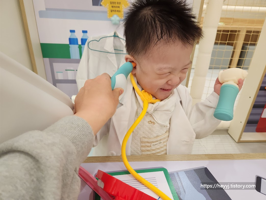 다음으로 찾아간 미니 병원놀이 존! 청진기를 목에 걸고, 진지하게 장난감 채소로 요리를 하는 모습에서 웃음이 멈추질 않았다.
